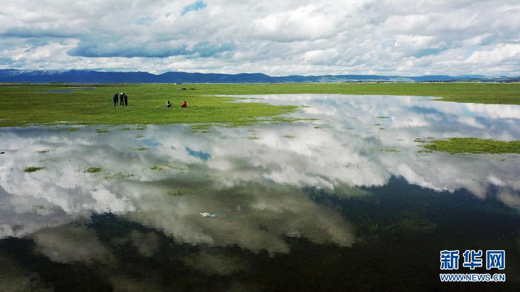 游客在甘肃省玛曲县河曲马场上游览(2019年6月22日摄,无人机照片)。新华社记者 陈斌 摄