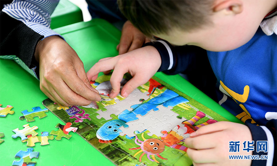 3月30日,安徽省淮南市红雨伞特教中心年轻教师与孩子们玩拼图互动游戏。