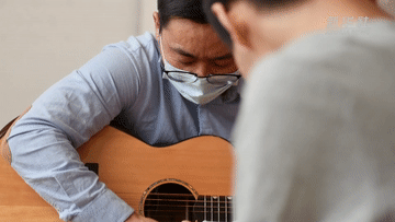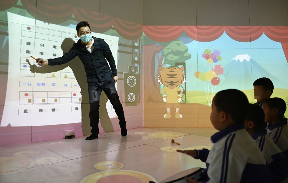 在“音乐魔方”教室内,周鹏程给患有自闭症的学生上课。