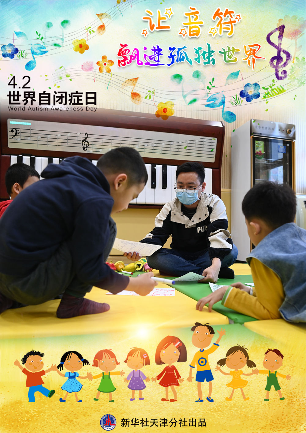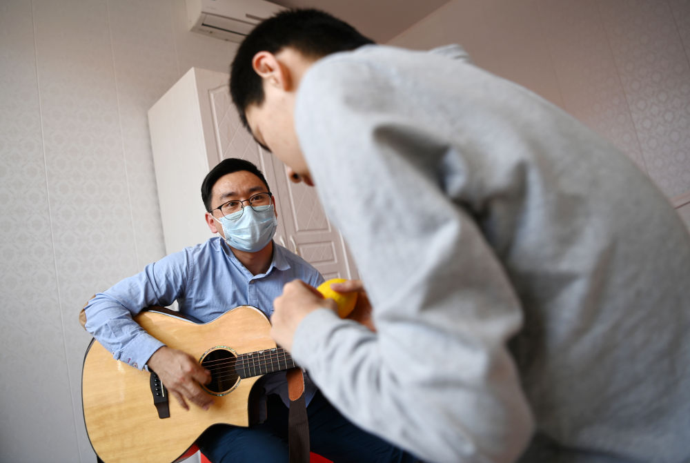 在天津市北辰区西堤头村,周鹏程给患有自闭症的学生进行音乐康复治疗。