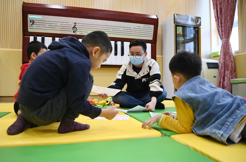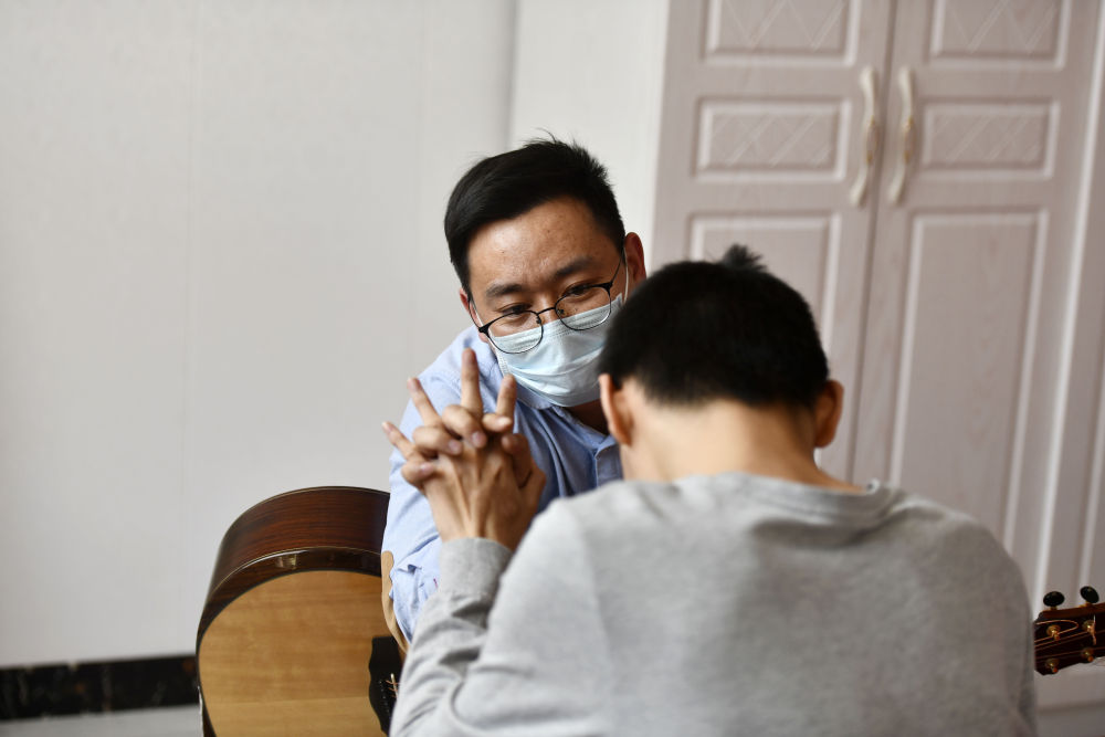 在天津市北辰区西堤头村,周鹏程在给患有自闭症的学生进行音乐康复治疗。