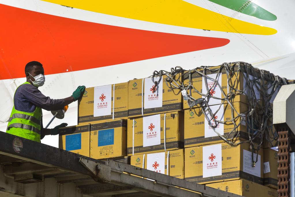 3月30日,工作人员在埃塞俄比亚亚的斯亚贝巴博莱国际机场卸载中国政府援助的疫苗。