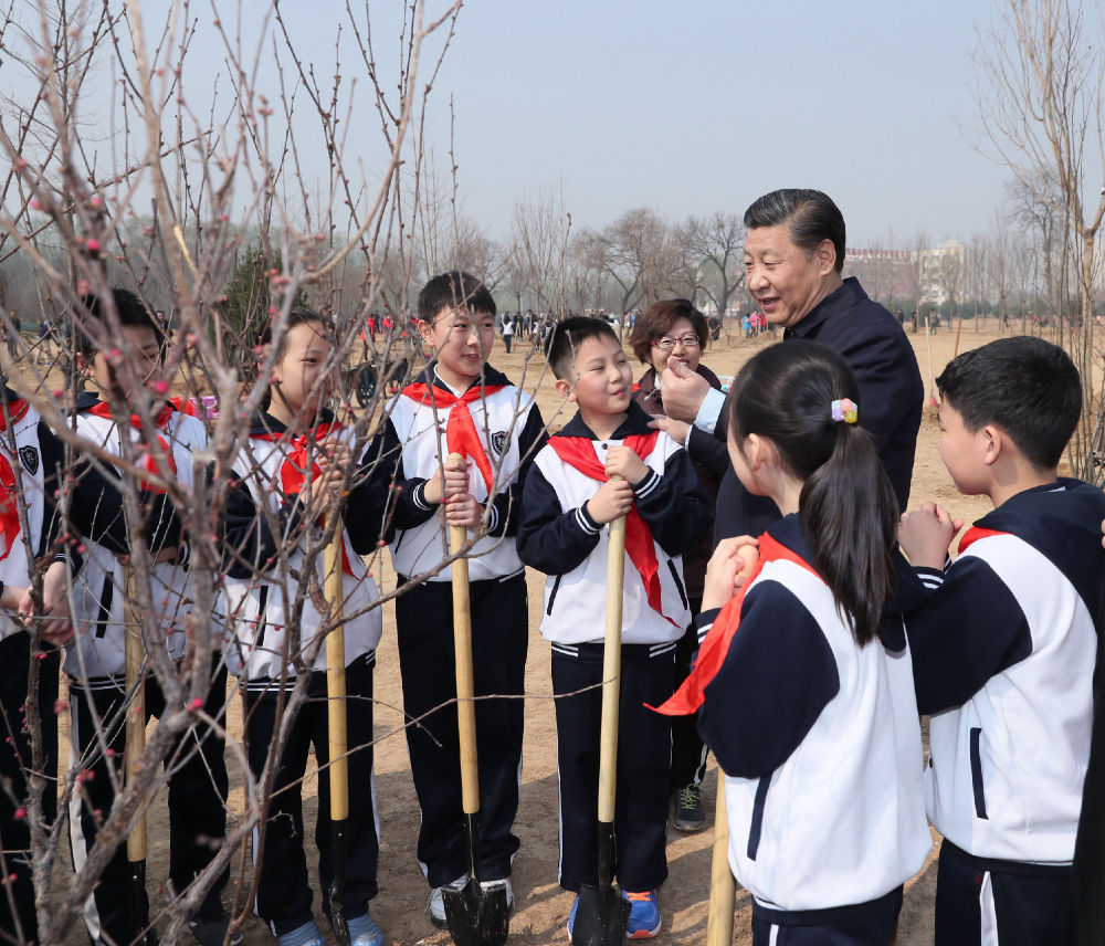 2017年3月29日,习近平在北京市朝阳区将台乡同参加植树的少先队员交谈。