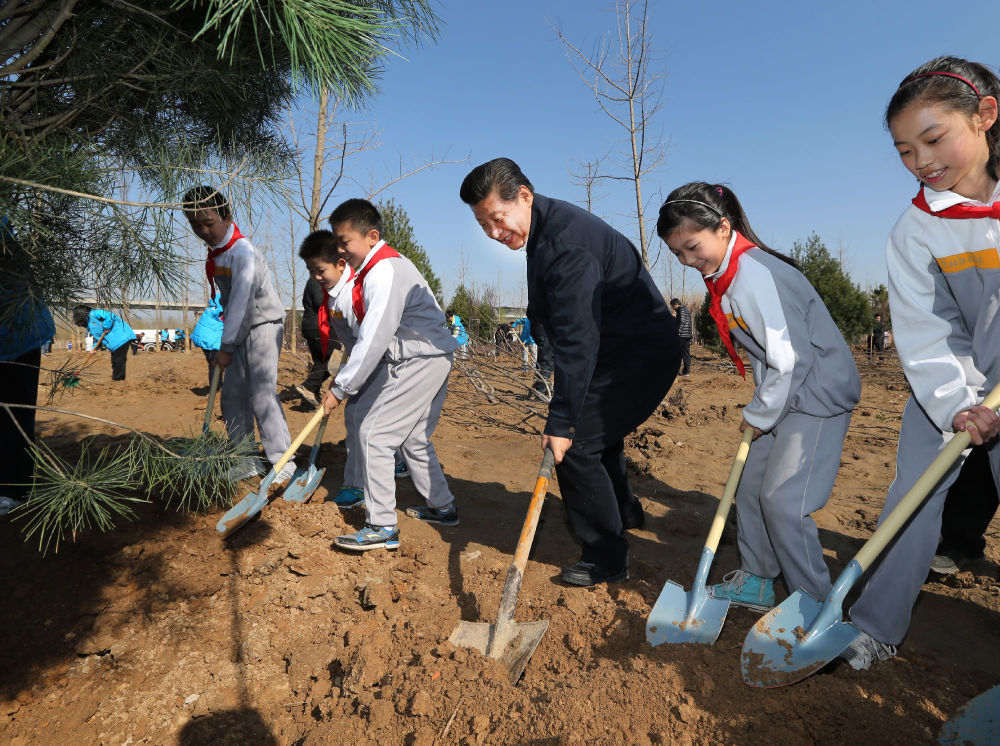 2013年4月2日,习近平在北京市丰台区永定河畔同少先队员一起给刚栽下的银杏树浇水。