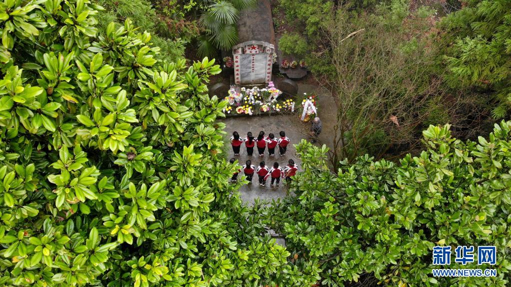 4月1日,叶观山和前来祭奠的义安区钟鸣镇金榔中心小学学生一同默哀(无人机照片)。