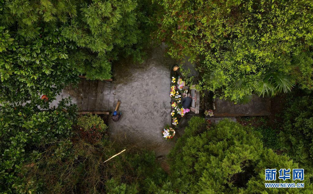 4月1日,叶观山和妻子戴小菊在打扫水龙烈士墓墓地(无人机照片)。