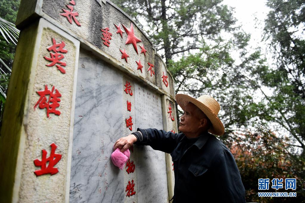 4月1日,叶观山在擦拭水龙烈士墓墓碑。