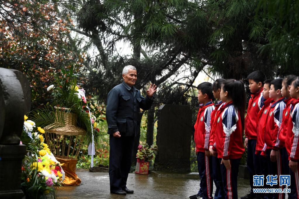 4月1日,叶观山向前来祭奠的义安区钟鸣镇金榔中心小学学生介绍烈士的英雄事迹。