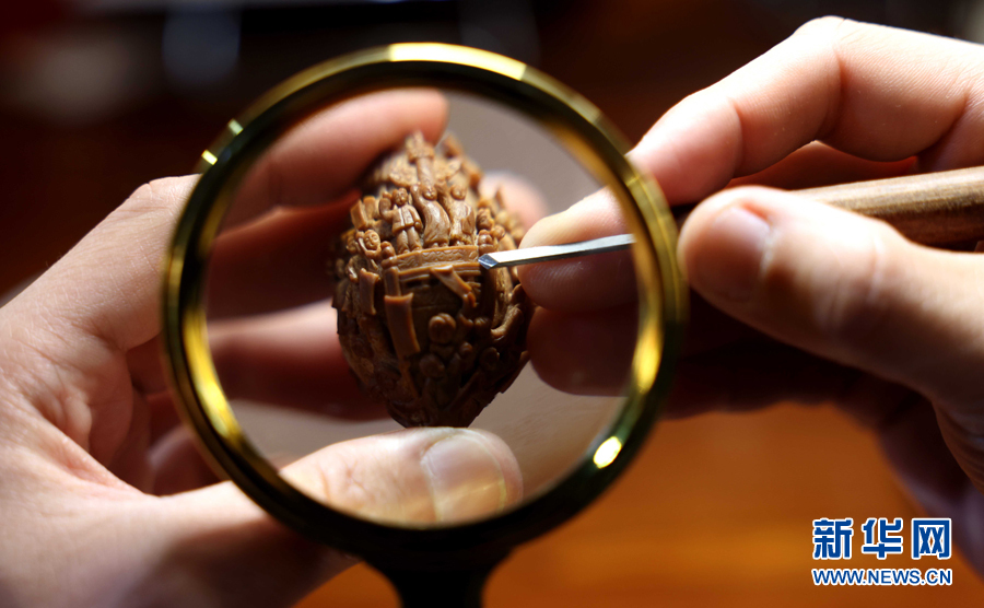 4月1日,在合肥市瑶海区明光路街道党群服务中心,“核雕”非遗传承人李绩在创作“建党百年”主题非遗作品。