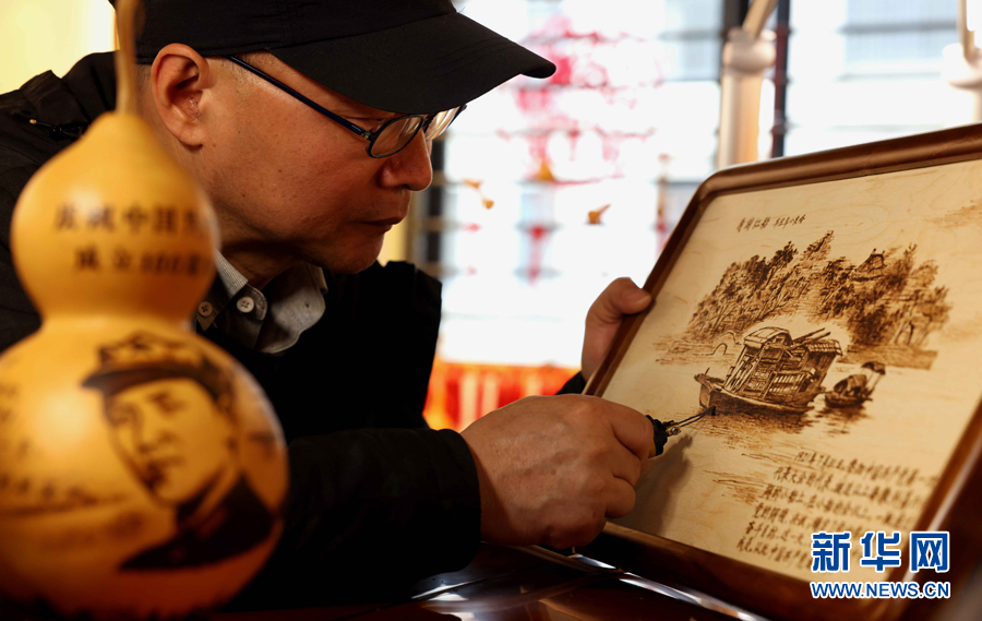 4月1日,合肥市瑶海区明光路街道党群服务中心,“葫芦烙画”非遗传承人郑小良在创作“建党百年”主题非遗作品。