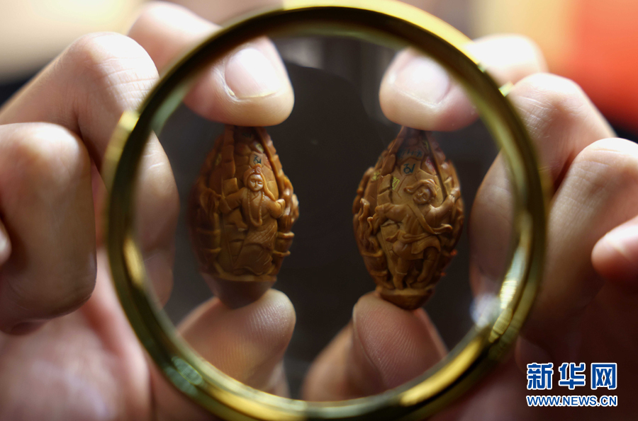 4月1日,在合肥市瑶海区明光路街道党群服务中心,“核雕”非遗传承人李绩展示“建党百年”主题非遗作品。
