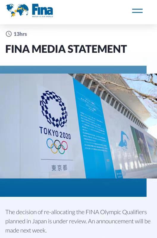 4月18日至23日在东京水上中心举行的跳水世界杯率先被叫停,如今,5月1日至4日在东京举行的花样游泳奥运资格赛和5月29日至30日在福冈举行的马拉松游泳奥运资格赛被取消。国际泳联表示,正在研究各个项目奥运参赛名额的分配方案,将于下周宣布结果。