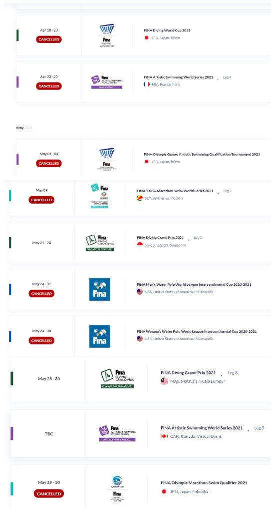 国际泳联取消的其他几项国际赛事包括:4月23日至25日在法国巴黎举行的花样游泳世界系列赛第四站、5月9日在塞舌尔举行的马拉松游泳世界系列赛、5月24日至31日在美国印第安纳举行的男子和女子水球世界联赛洲际杯赛。