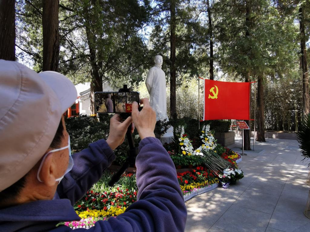 4月3日清明假期首日,位于北京市万安公墓内的李大钊烈士陵园内,市民在拍摄李大钊烈士的雕像。新华社记者邰思聪摄