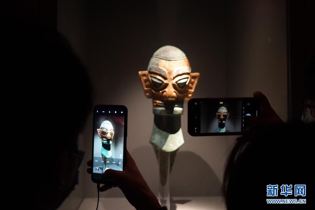 4月3日,参观者在三星堆博物馆参观金面铜人头像。