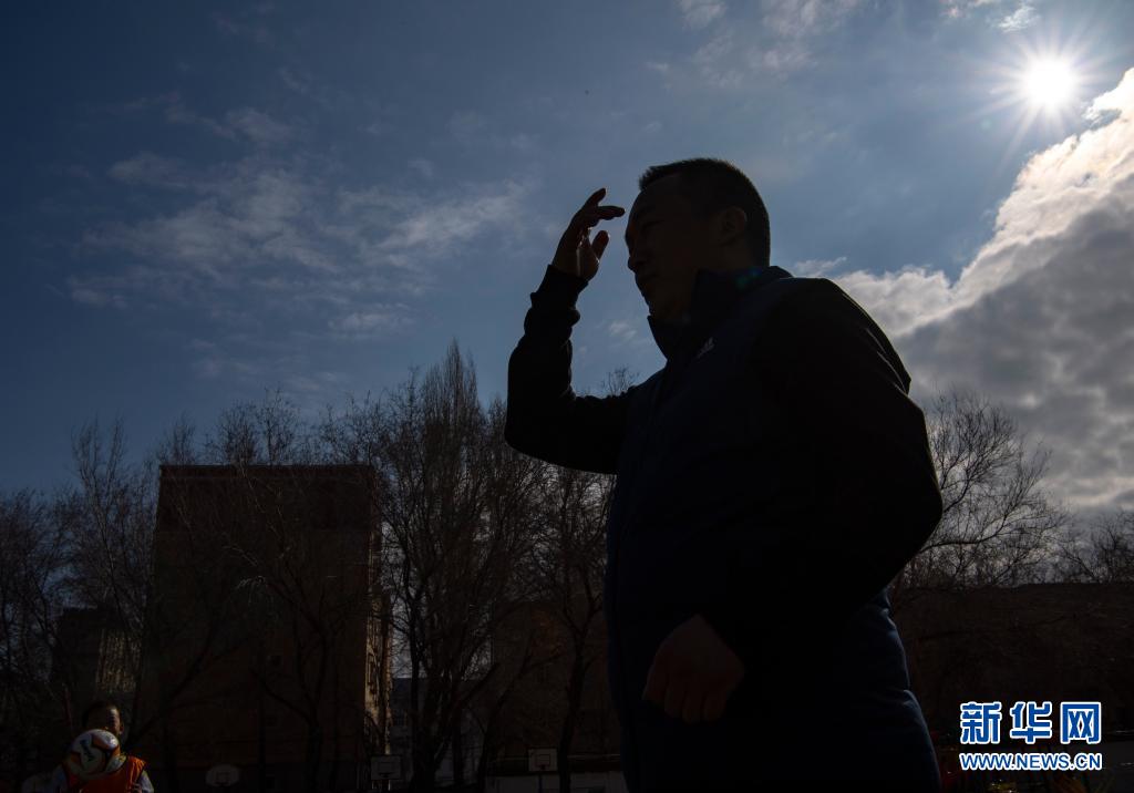 夏松豪在操场上为学生讲解利用身体处理球的动作技巧(4月1日摄)。新华社记者 胡虎虎 摄