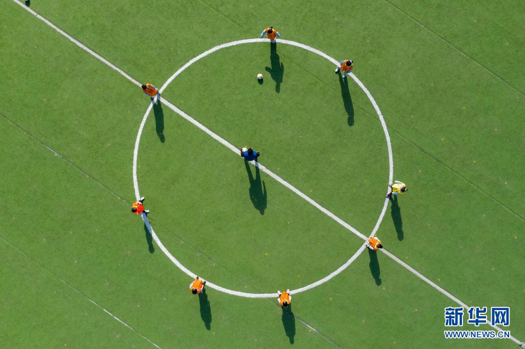 夏松豪(中)带着学生在沙湾二小操场上进行训练(无人机照片,4月1日摄)。新华社记者 胡虎虎 摄