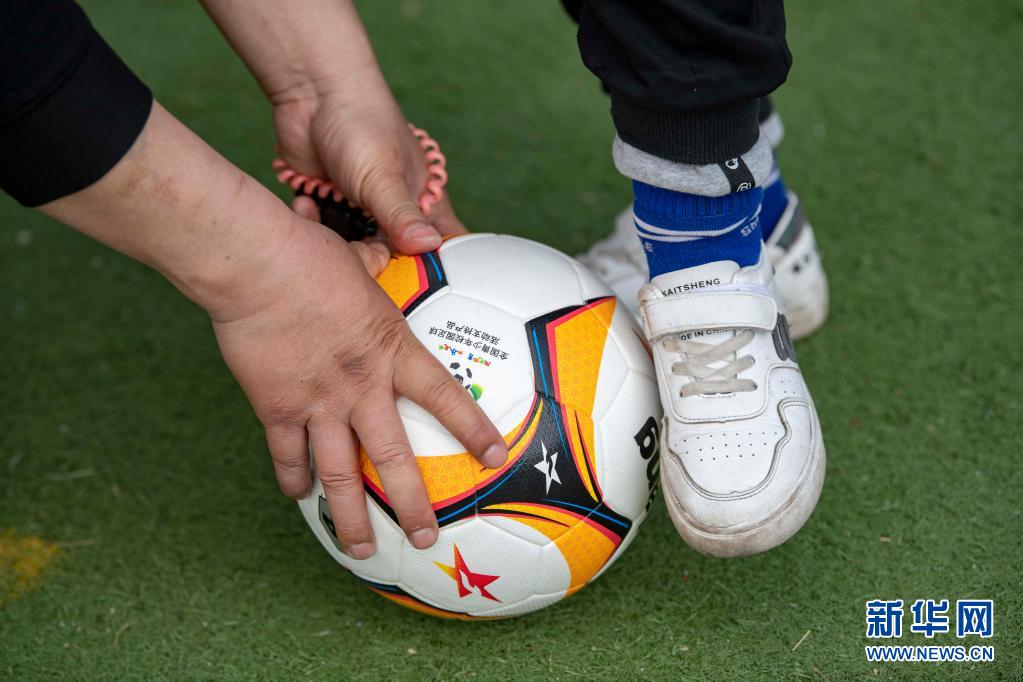 夏松豪在训练中帮助学生感知用脚触球的部位(3月31日摄)。新华社记者 胡虎虎 摄