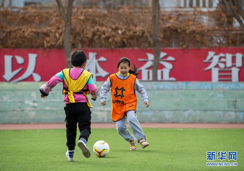 新疆沙湾二小的学生张智心(右)与曼孜热·艾西丁在练习时拼抢(3月31日摄)。新华社记者 胡虎虎 摄