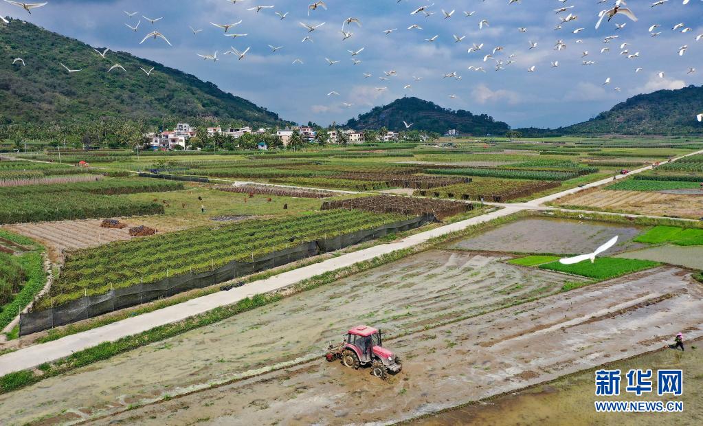 4月5日,海南省陵水黎族自治县光坡镇的农民在田间劳作(无人机照片)。