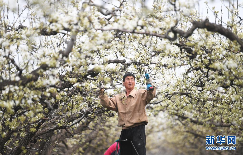 4月5日,河北省雄安新区雄县雄州镇马蹄湾村果农在梨园为梨树剪枝。