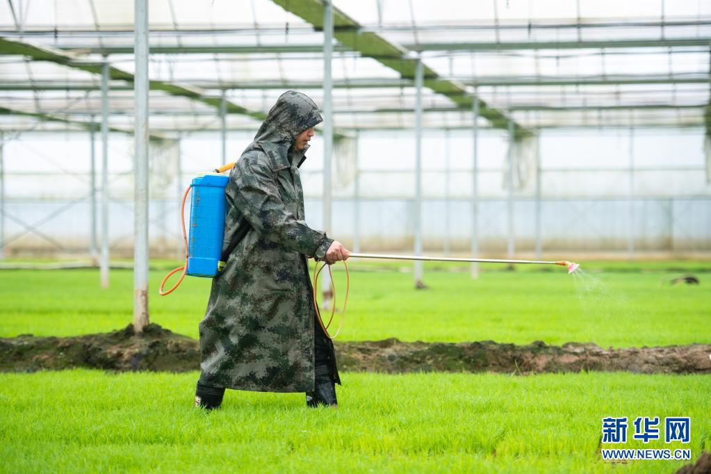 4月5日,在湖南省浏阳市龙伏镇鼎钧种养专业合作联合社水稻育秧工厂,工作人员给秧苗施肥。