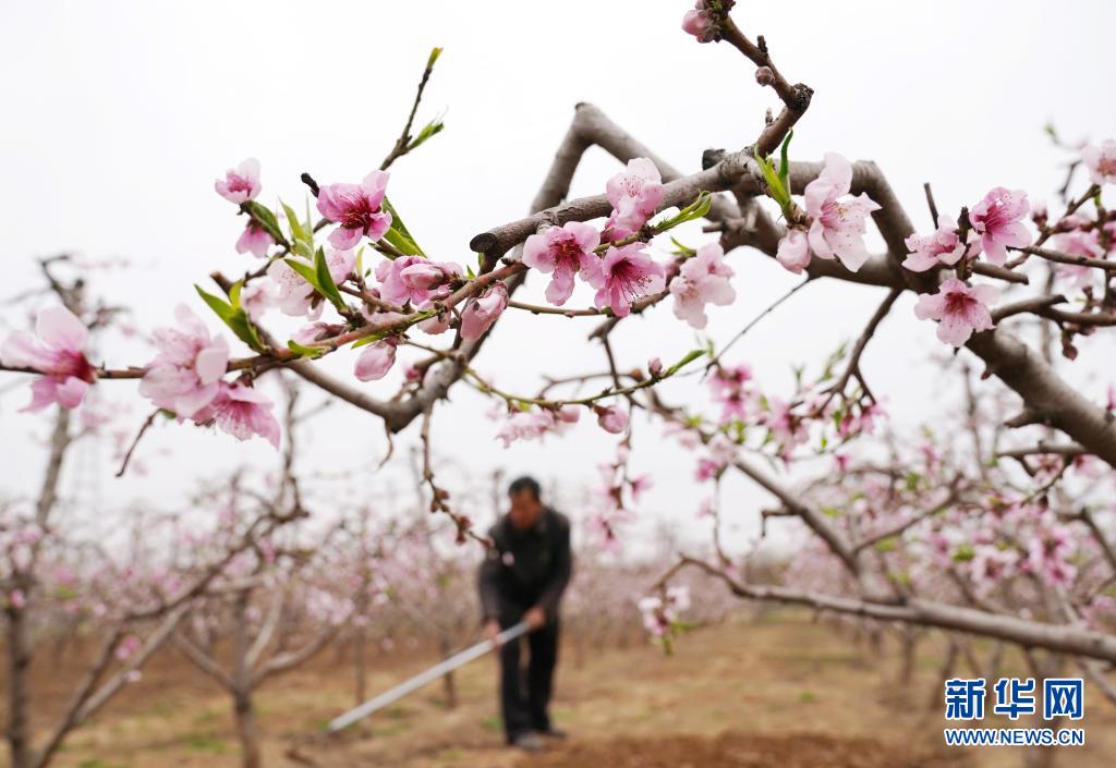 4月5日,河北省顺平县河口乡大李各庄村的农民在桃园内除草。