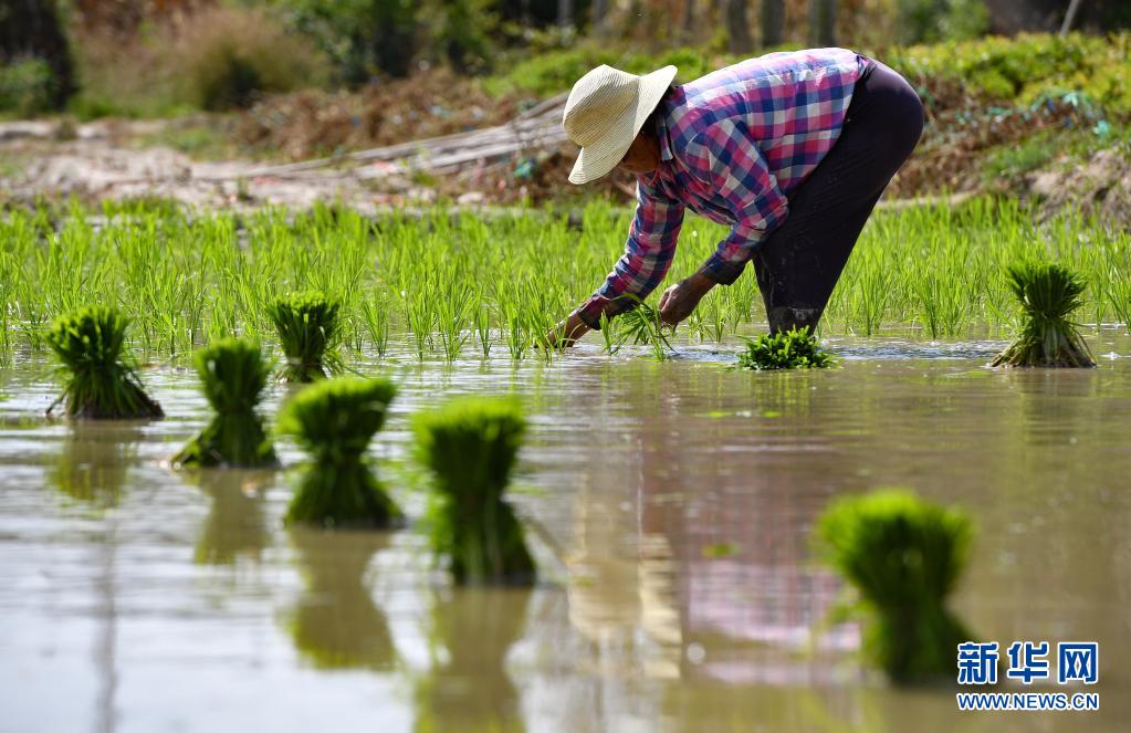 4月5日,海南省陵水黎族自治县光坡镇的农民在插秧。