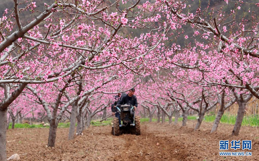 4月5日,河北省石家庄市井陉县测鱼镇杨庄村村民驾驶农机在桃园里作业。