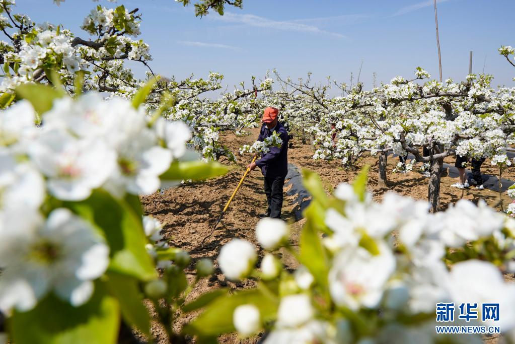 4月5日,在江苏省连云港市赣榆区赣马镇黑坡村黄金梨基地内,果农给梨树松土。