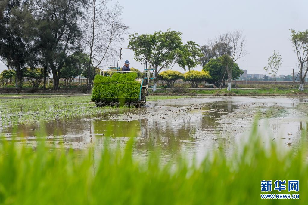 4月5日,在福建省石狮市科技种子试验场,农民驾驶插秧机在田里插秧。