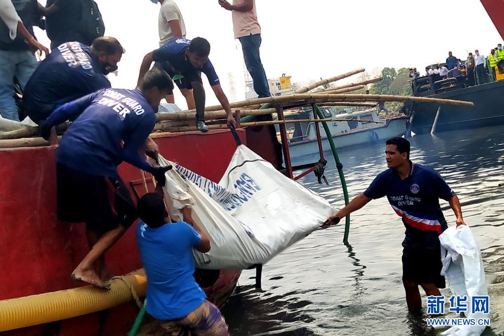 4月5日,搜救人员在孟加拉国纳拉扬甘杰地区打捞起沉船。新华社发