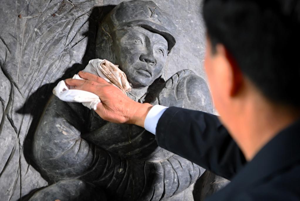 4月2日,曾祥有在金刚台“红军洞”里擦拭雕塑。新华社记者郝源摄