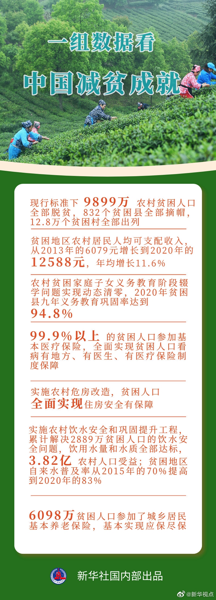 国务院新闻办公室6日发布《人类减贫的中国实践》白皮书说,今年是中国共产党成立100周年。100年来,中国共产党团结带领人民,以坚定不移、顽强不屈的信念和意志与贫困作斗争。中共十八大以来,在以习近平同志为核心的党中央领导下,中国组织实施了人类历史上规模空前、力度最大、惠及人口最多的脱贫攻坚战。经过8年持续奋斗,到2020年底,中国如期完成新时代脱贫攻坚目标任务。一组数据看中国减贫成就↓