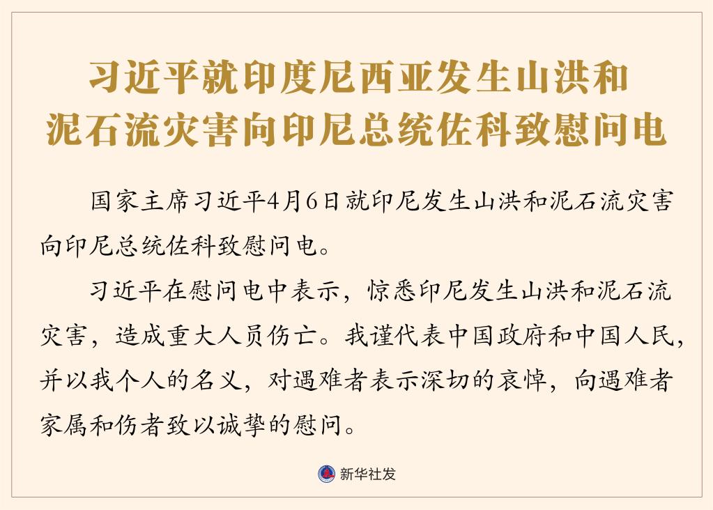 新华社北京4月6日电 国家主席习近平4月6日就印尼发生山洪和泥石流灾害向印尼总统佐科致慰问电。