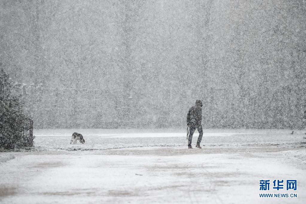 4月6日,一名市民在比利时布鲁塞尔五十周年纪念公园冒雪遛狗。
