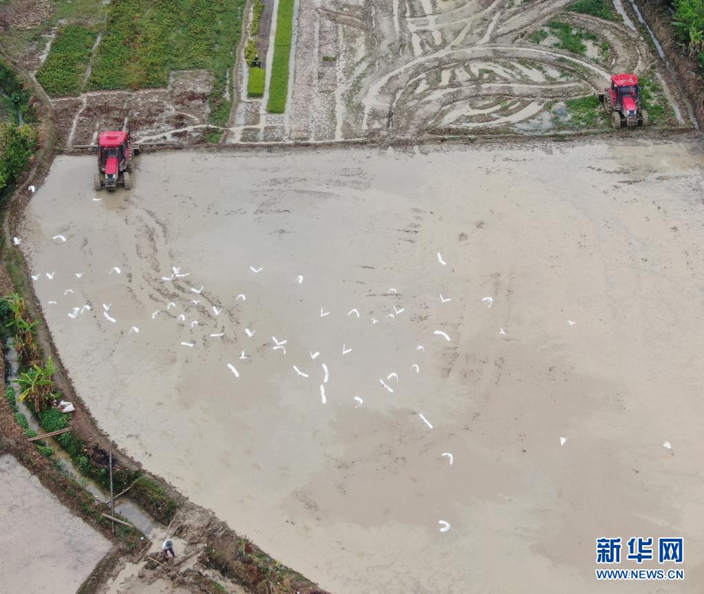 4月5日,云南西双版纳傣族自治州勐海县勐遮镇曼么勒村的农民驾驶拖拉机耕田(无人机照片) 。