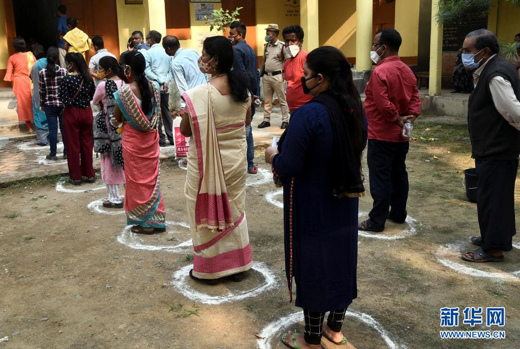 4月6日,选民在印度高哈蒂参加阿萨姆邦第三阶段议会选举投票时保持社交距离。
