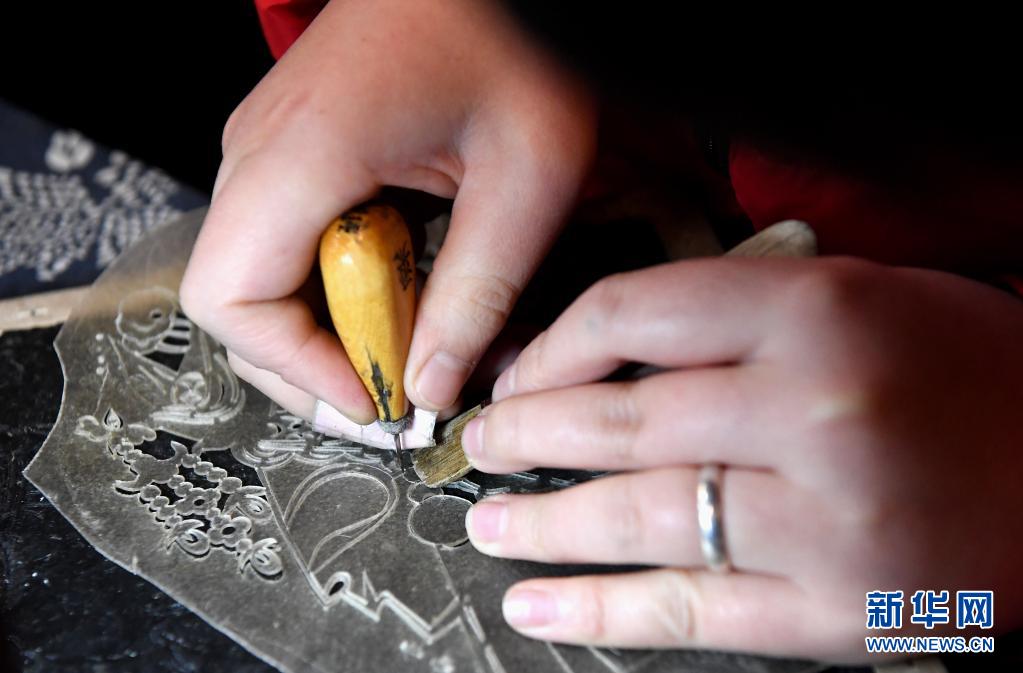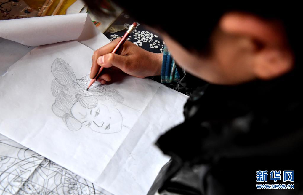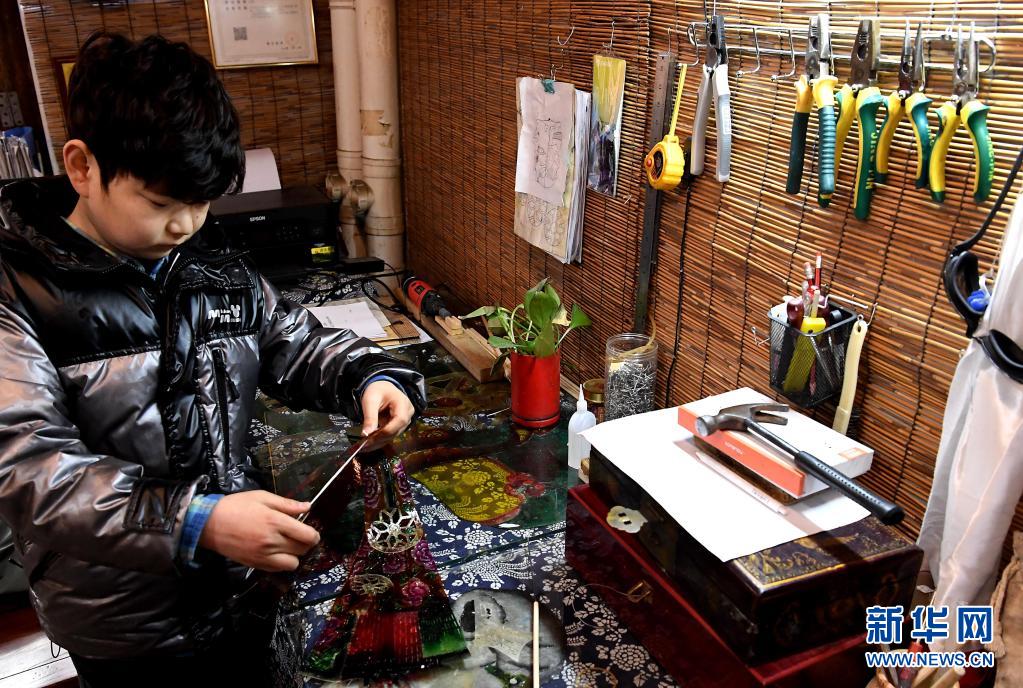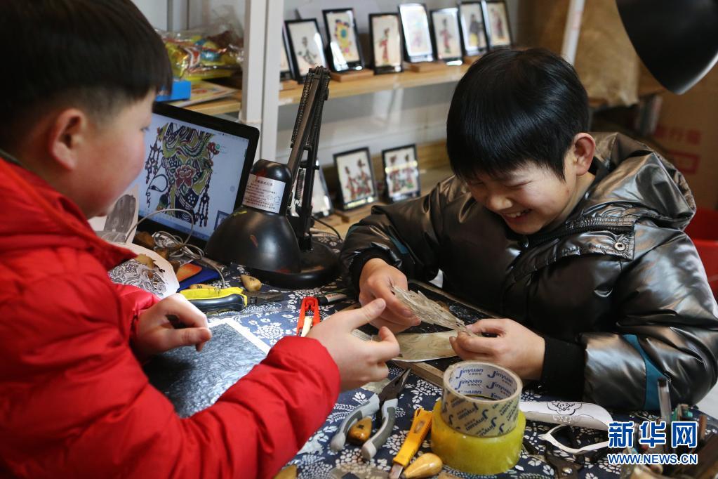 精灵梦皮影艺术团的演员在工作室里雕刻皮影(3月19日摄)。新华社记者 李安 摄