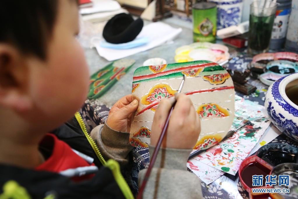 精灵梦皮影艺术团的演员在进行皮影制作的上色工序(3月19日摄)。新华社记者 许雅楠 摄