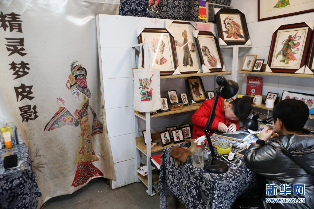 精灵梦皮影艺术团的演员在工作室里雕刻皮影(3月19日摄)。新华社记者 许雅楠 摄