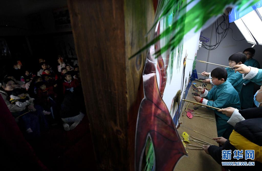 精灵梦皮影艺术团的演员为小朋友表演皮影戏(3月19日摄)。新华社记者李安摄