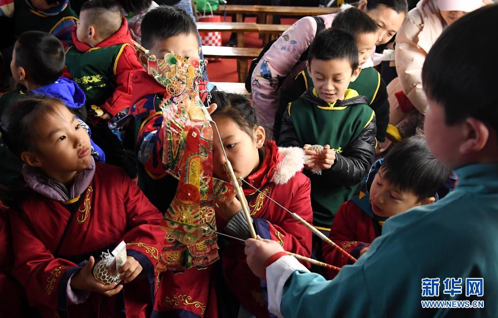 精灵梦皮影艺术团的演员和小朋友们互动(3月19日摄)。新华社记者 李安 摄