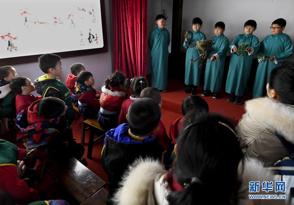 精灵梦皮影艺术团的演员为小朋友讲解皮影戏知识(3月19日摄)。新华社记者 许雅楠 摄