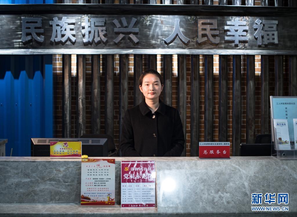 社区工作者袁芳在武汉市工人村街道青和居社区拍摄的肖像(3月30日摄)。
