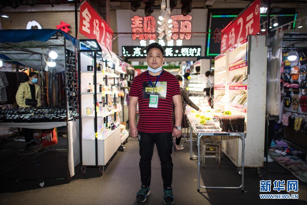武汉保成路夜市靓丽化妆品店店主肖昊在摊位前拍摄的肖像(3月29日摄)。