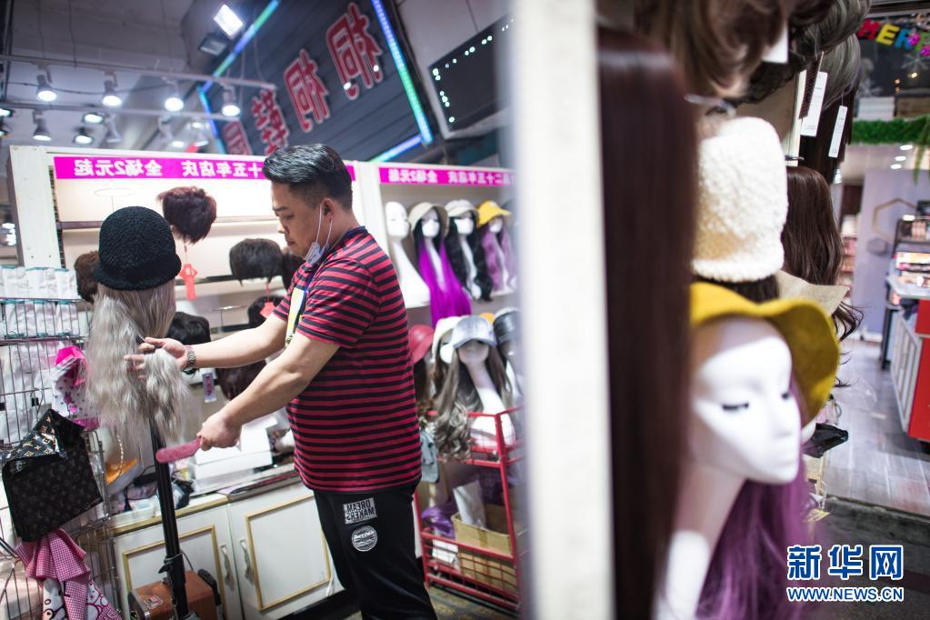武汉保成路夜市靓丽化妆品店店主肖昊在店内整理商品(3月29日摄)。