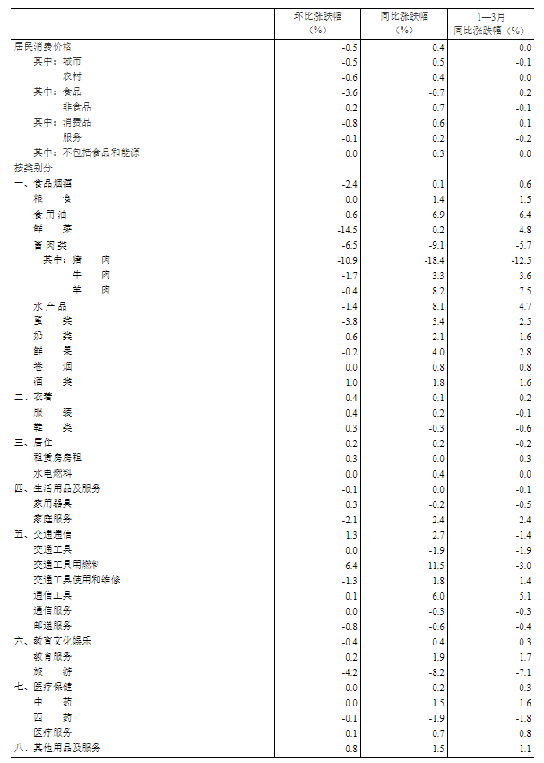 3月份,全国居民消费价格环比下降0.5%。其中,城市下降0.5%,农村下降0.6%;食品价格下降3.6%,非食品价格上涨0.2%;消费品价格下降0.8%,服务价格下降0.1%。