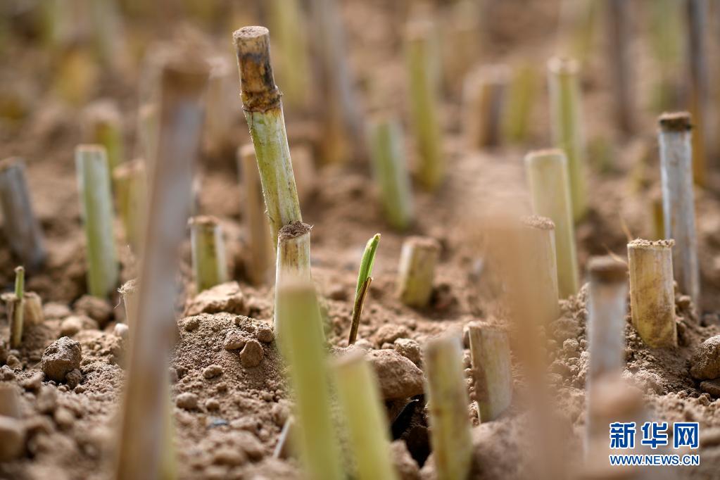 宁夏银川市永宁县闽宁镇园艺村大棚里栽植的菌草发出嫩芽(3月29日摄)。