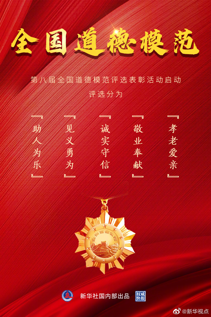 中宣部、中央文明办等6部门近日启动第八届全国道德模范评选表彰。此次评选分为“助人为乐模范”“见义勇为模范”“诚实守信模范”“敬业奉献模范”“孝老爱亲模范”5类,通过群众推荐、遴选审核、公示宣传、投票评选等步骤产生,将于9月举行颁奖仪式。一起来推荐你身边可亲可敬可学的道德榜样吧!(记者王子铭,海报设计张晨光)